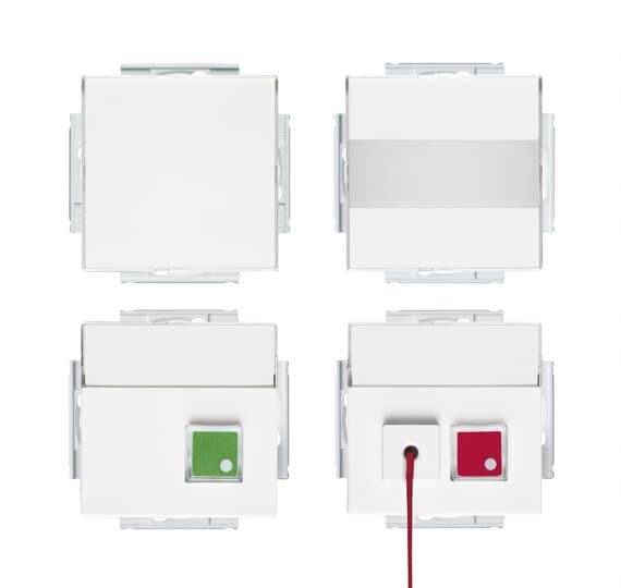 Bestehend aus: Netzteil-Einsatz, Alarmmelde-Einsatz, Signaltaster-Einsatz mit Zugschnur und Abstelltaster-Einsatz. Rufauslösung über Zugschnurtaster. Optische und akustische Notrufsignalisierung außerhalb des Behinderten-WCs. Beruhigungslicht bei Rufauslösung. Abstelltaster zum Aufheben des Notrufs Beschriftungsfeld: 51 x 10 mm. Für Installationen nach DIN VDE 0834 wird eine Notstromversorgung benötigt. Keine Spreize. Schraubbefestigung über Schlüssellöcher. Inkl. Zentralscheibe.