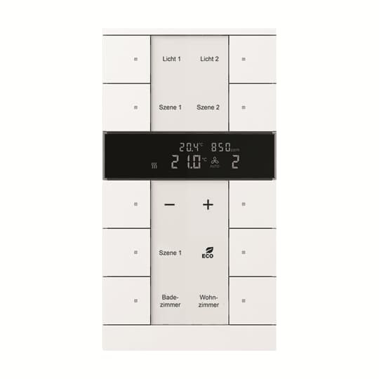 Bedienelement mit Raumtemperaturreglerfunktion und CO2-/Feuchtesensor.