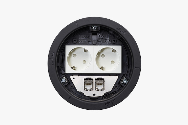 Die kompakte Bodensteckdose nutzt den Anschlussraum optimal aus: Auf nur 122 mm Einbaudurchmesser passen zwei 230-V-SCHUKO®Steckdosen und zwei Daten-/Multimediaanschlüsse. Alle Steckplätze sind gleichzeitig nutzbar.