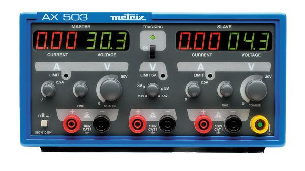 Sehr leicht und robust - die dreifache Stromversorgung mit dem AX503: 2x 30 V/2,5 A + 2,7-5,5 V/5 A, weist eine Strombegrenzung bei Kurzschluss und eine Regelung der Temperatur bei Überlasten und Überhitzung auf. Die Ausgänge sind schutzisolierte Sicherheitsbuchsen. Dies gilt auch für den Erdungsanschluss. Leistungsmerkmale: • Lineartechnologie sorgt für Stabilität und geringes Rauschen, • Schutz gegen Kurzschluss und Überhitzung, • schutzisolierte Ausgänge, • Ringtransformator mit hohem Wirkungsgrad und ohne Zwangsbelüftung, • durch Reihen- oder Parallelschaltung können bis 60 V/2,5 A oder 30 V/5 A erzeugt werden • Verwendung eines "Tracking"-Modus für die zwei 30 V-Ausgänge zur gleichzeitigen Anpassung (Master/Slave) • dritter Ausgang 2,7 V-5,5 V/5 A für die Versorgung von Logikschaltkreisen (TTL/CMOS).