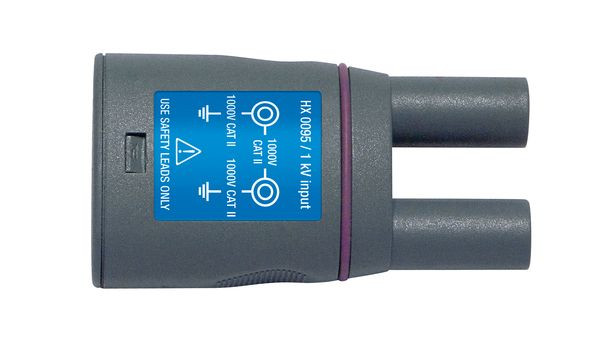 Zubehör für SCOPIX Oszilloskope OX 9000 / OX 7000. Adapter Probix / Ø 4 mm Buchse (Banane) zum Anschluss von Zubehör mit Ø 4 mm Steckern zur Spannungsmessung. Integrierter Teiler 1/2 für die Messung von Spannungen bis 1000 V mit < 200 kHz Bandbreite. Sehr nützlich für z.B. Multimeter-Messungen an Energieanlagen mit Spannungen von mehr als 600 V zwischen den Phasen. 1000 V CAT IV