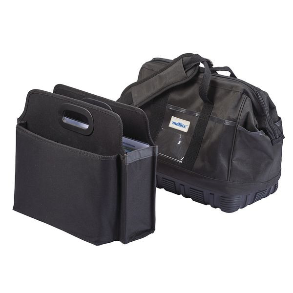Hochwertige Transporttasche aus Stoff im Metrix Design. Mit abgedichtetem Boden, Schultergurt und zusätzlicher herausnehmbarer Innentasche mit Unterteilungen. Abmessungen: 380 x 280 x 200 mm. Geeignet für Metrix Oszilloskope SCOPIX IV (OX 9000).