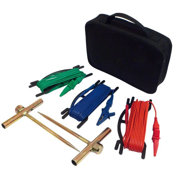 Kompletter Satz mit qualitativ hochwertigem Messzubehör zur Messung von Erdungswiderständen und spezifischen Erdwiderständen. . Geliefert mit: 1 Transporttasche, 2 Erder (T-förmig), 1 Haspel mit 15 m Messleitung (grün), 1 Haspel mit 15 m Messleitung (blau), 1 Haspel mit 15 m Messleitung (rot)