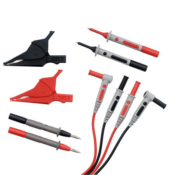 Zubehör für Installationen CAT IV & CAT III. 2 ummantelte Prüfspitzen 1000 V CAT IV. 2 PVC-Messleitung rot / schwarz mit geradem und Winkelstecker - 1,5 m - 1000 V CAT IV. 2 Krokodilklemmen rot / schwarz 1000 V CAT IV. 2 ummantelte Prüfspitzen Ø 4 mm 300 V CAT II.
