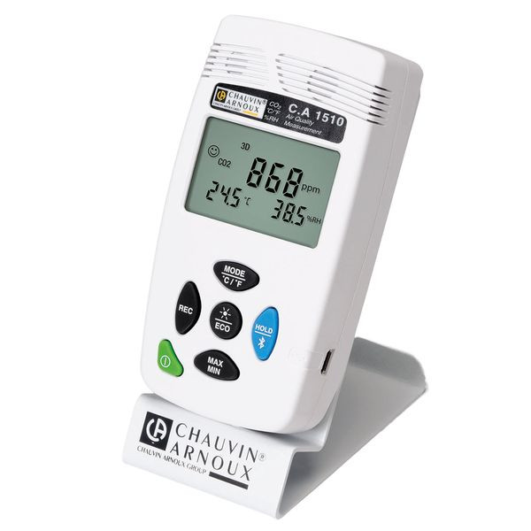 Ersatzteil für Prüfgerät für die Raumluftqualität C.A 1510 weiß / Zubehör für schwarzes Modell. Mobiler, metallischer Tischaufsteller mit CHAUVIN ARNOUX Logo. Durch die magnetische Rückseite des Geräts haftet es fest am Aufsteller.