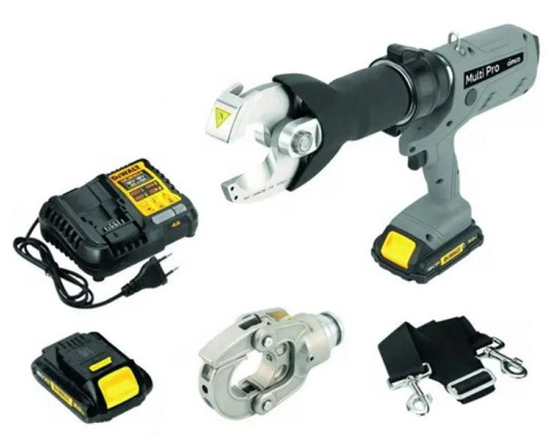 Das akkuhydraulische Wechselsystem MultiPro ermöglicht dank austauschbarer Wechselköpfe die Durchführung ver-schiedenster Anwendungen mit nur einem Gerät in professioneller Qualität, das Grundgerät bietet eine Kraft von 62 kNund einen Hub von 32 mm, eine LED sorgt für die Ausleuchtung des Arbeitsbereiches, die Verriegelung der Wechselköpfe ist einfach zu handhaben, das Gerät verfügt über einen automatischen Rücklauf beim Schneiden und Pressen sowie über eine manuelle Rücklaufoption für Notfälle, die ausbalancierte und ergonomische Gehäuseform sorgt für komfortable Handhabung, zudem verhindert die Motorbremse ein gefährliches Nachlaufen des Kolbens, mit einer Zykluszeit von 3-7 Sekunden und einem Servicezyklus von 20.000 Arbeitsgängen ist das Gerät effizient und langlebig, die Köpfe sind um 180° drehbar für flexible Einsätze, eine Ladestandsanzeige informiert über den Akkustand, und das 18 VLi-ion DEWALT Akkusystem sorgt für zuverlässige Leistung, optional kann ein Schultertragegurt befestigt werden umden Komfort weiter zu erhöhen, das MultiPro Wechselsystem ermöglicht mit separat erhältlichen Einsätzen Pressungen bis zu 300 mm², der Schneidkopf erlaubt das Schneiden von Aluminium- und Kupferleitungen sowie das Schneiden von Kabeln bis zu einem Durchmesser von 50 mm (Kabelklasse 2/5/6 nach IEC 60228), Achtung - der Schneidkopf ist nicht für stahlverstärkte Leitungen (ACSR) geeignet!