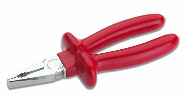 1.000 V Kombinationszange- tauchisoliert, VDE-geprüft. Griffe mit zweifarbiger Kunststoff-Tauchisolation für optimale Sicherheit. Bei Beschädigung der äußeren roten Isolationsschicht signalisiert die nun sichtbare untere orangefarbene Kunststoffisolation, dass nicht mehr eine 100-prozentige Sicherheit gemäß den Sicherheitsnormen gegeben ist. Kombinationszange nach DIN ISO 5746, eingelegtes Gelenk, mit induktiv gehärteter Präzisionsschneide (ca. 64 HRC), für alle Drähte, auch für Pianodraht, aus Spezialwerkzeugstahl, gezahnten Greiffflächen und gezahnter Aussparung (Brennerloch) Länge 180 mm (7")