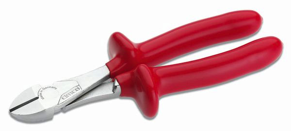 nach DIN ISO 5749, aufgelegtes Gelenk, mit abgesetzter Präzisionsschneide, für gehärteten Stahldraht (Pianodraht), harten Draht und mittelharten Draht Tauchisolierte Sicherheitszange, VDE-Geprüft - Griffe mit zweifarbiger Kunststoff-Tauchisolation für optimale Sicherheit. Bei Beschädigung der äußeren roten Isolationsschicht signalisiert die nun sichtbare untere orangefarbene Kunststoffisolation, dass nicht mehr eine 100-prozentige Sicherheit gemäß den Sicherheitsnormen gegeben ist. 1.000 V Kraft -Seitenschneider DIN ISO 5749 A, aufgelegtes Gelenk, mit induktiv gehärteter Präzisionsschneide ( ca. 64 HRC), für alle Drähte, auch für Pianodraht, aus Elektrostahl. Länge 200 mm (8")
