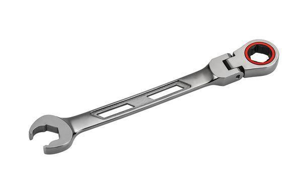 T120 FLEX Knarren-Ringmaulschlüssel mit Feinstverzahnung für ratschendes Lösen oder Schnellanzug von Schrauben und Muttern in einem Zug. 120 Zähne stehen für höchste Performance und minimalste Rückholwinkel bereits ab 3°. Ringschlüssel-Element um 2x90° schwenkbar für Arbeiten von oben oder in beengten Bauräumen. Links- oder Rechtslauf durch einfaches Wenden des Schlüssels, mit zusätzlicher Farbmarkierung. Das Gabelschlüssel-Werkzeug mit der individuellen entwickelten Flanken-Geometrie ermöglicht das Zurücksetzeten des Schlüssels in de Arbeitsebene- vergleichbar mit einer Ratschenfunktion ist kein Abheben des Gabelschlüssels erforderlich! Ergonomisches Griff-Design mit nur 3 mm Bauhöhe für hervorragende Kraftübertragung. Aus Chrom-Vanadium-Stahl, spezielgehärtet. Oberfläche vernickelt matt schwarz. SW 10 mm; Länge: 160 mm