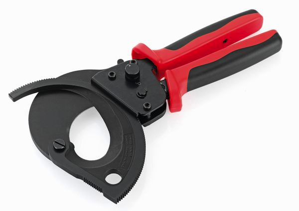 Einhand-Ratschen-Kabelschneider; zum quetschfreien Schneiden von Kabeln mit einem Außendurchmesser von max. 45 mm. Geeignet für Kupfer und Aluminiumkabel, nicht geeignet für Stahldraht, stahlarmierte Kabel und hartgezogene Cu-Leiter. Sauberer Schnitt durch scharfe spezialgehärtete Schneiden, trotz kompakter Bauform dank Ratschenmechanik mit nadelgelagerter Exzenterübersetzung und ergonomischen Handgriffen mit geringer Öffnungsweite nur mit einer Hand kraftschonend bedienbar. Die Handgriffe sind jedoch lang genug, um bei Lastspitzen die zweite Hand unterstützend einzusetzen. Gewicht nur 980 g. Bewegliche, voll durchschwenkbare und in jeder Stellung entriegelbare Schneide, Arretierung der Griffe über Drehknopf (Schloss-Symbol), leichte Öffnung der Schneidmesser durch in Offenstellung arretierbarer Sperrklinke. Max. Schneidleistungen: Cu (Kupfer) max.ø 65 mm; mehrdrähtig 400 mm²/800 mCM; Sektorleiter 4x150SM; AL (Aluminium) max. ø 60 mm; mehrdrähtig 400 mm²/800 mCM; Sektorleiter 4x185SE