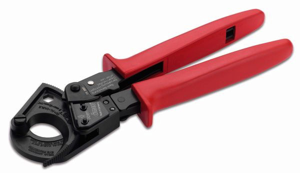 mit Ratschenantrieb, Einhandbetätigung durch optimale Hebelübersetzung und schrittweises Schneiden, Entriegelungsmöglichkeit in jeder Schneidposition, alle Teile aus hochfestem Spezialstahl, Schneiden und beanspruchte Teile vergütet oder gehärtet, Oberfläche brüniert, ergonomisch geformte Soft-Handgriffe, für Kupfer- und Aluminiumkabel, Einzel- und Mehrleiter