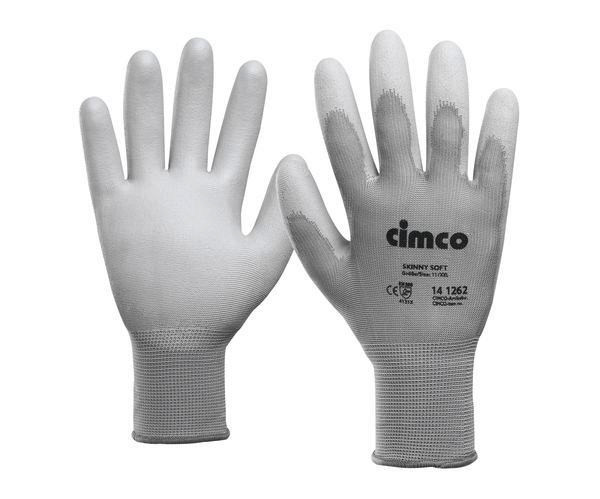 Arbeitshandschuh "Skinny Soft" grau, Größe 8/M, Saumfarbe: schwarz; Gauge 13; Nylonhandschuh mit Strickbund und PU-Beschichtung, teilbeschichtet auf Innenhand und Fingerkuppen, sehr eng anliegend, nach DIN EN 388. 1 Paar
