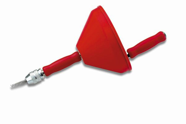 Rohrreiniger Rohrteufel; universell einsetzbares Rohrreinigungsgerät für alle Reinigungen von Rohren mit 10-55 mm Ø, z. B. Abflussrohre, Spülen, Waschbecken, Duschabläufe, Badewannen und WCs, mit Kurbel für Handbetrieb und Sechskant-Aufnahme für elektronisch regelbare Bohrmaschinen. Spirale aus feuerverzinktem Pianodraht, 7,5 m lang, 8 mØ.