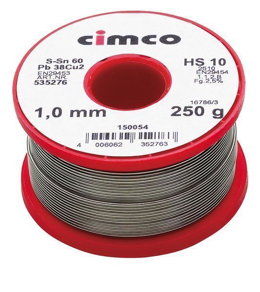 Elektroniklot nach DIN EN 29453, mit aktiviertem Harz-Flussmittel, nicht korrosiv auf NE-Metallen, schnell fließend, Flussmittel nach DIN EN 29454-1 .1.2B2,5% (Gew. %2,5±0,5) S-Sn60Pb38Cu2, auf Einwegspulen; Gewicht: 500 g.