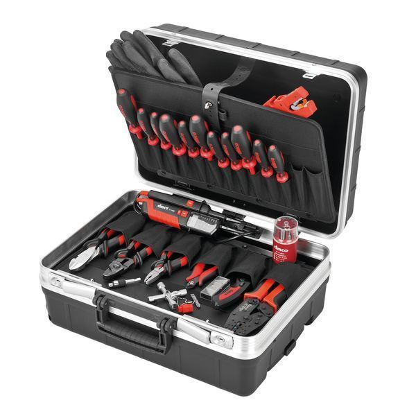 Robuster Werkzeugkoffer mit Trolleyfunktion aus stoßfestem Kunststoff mit stabilem Aluminiumrahmen, Zwei robuste, abschließbare Kippschlösser, Bodenschale im Spritzgussverfahren hergestellt mit zahlreichen Unterteilungsmöglichkeiten, Herausnehmbare Bodenabdeckplatte, Herausnehmbare Bodenabdeckplatte, einseitig mit Werkzeugtaschen bestückt, Herausnehmbare Werkzeugtafel mit Dokumentenfach und einer Vielzahl von Werkzeugeinsteckfächern, Größe: L x B x H: 395 x 455 x 205 mm, Gewicht: leer 3.450 g. Werkzeugkoffer-Bestückung: 1 x VDE-Kabelschere, für Kabel 18 mm², 1 x 1000 V Kraft-Seitenschneider, 200 mm , 3 x VDE-Schlitz-Schraubendreher SLIM , 2 x VDE-Schraubendreher mit Kombiprofil SLIM , 2 x VDE-Kreuzschlitz-Schraubendreher SLIM , 4 x VDE-TX®-Schraubendreher SLIM, 1 x Elektronik-Seitenschneider ohne Schneidwate, 132 mm , 1 x Universal Schaltschrankschlüssel, 1 x Profi-Schaltschrank-Wasserwaage, 250 mm , 1 x Automatische Abisolierzange für lexible Leiter, 1 x Aderendhülsenpresszange , 1x Telefonzange gebogen, 200 mm , 1 x Schraubenzange, 160 mm
