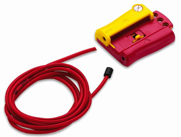 Multi-Verriegelungsklammer für Sperrelement, bei Verwendung von mehreren Sperrelementen, mit Verbotszeichen "nicht einschalten" (nach VBG 125) und Beschriftungsfeld. Lieferumfang: Gehäuse mit 2 m Sicherungsband.