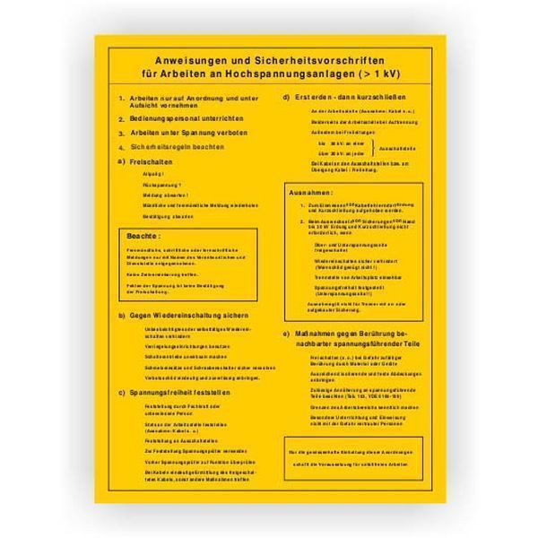Sicherheitsaushang "Anweisungen Sicherheitsvorschriften" für Arbeiten an Hochspannungsanlagen" Material: Kunststoff, gelb. Format: 300x400 mm