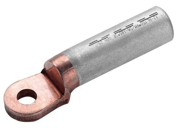 AL-CU-Presskabelschuhe aus E-Al und aus E-Cu gemäß EN 13600, blank, längsdicht mit massiver CU-Anschraublasche. Rohrabmessungen nach DIN 46329, mit Pressmarkierungen. Zum Verschrauben von ALU-Verbindungen auf CU-Schienen. Für zugentlastete Verbindungen von AL-Kabeln nach DIN 48201, Teil 1 und AL-Seilen nach DIN EN 50182. Für rundgedrückte Sektorleiter. Querschnitt rm/sm: 25 mm²; Querschnitt se: 35 mm²; Bolzen-Ø: M8; Kennziffer: 12; D1: 6,8 mm; D2: 8,5 mm; B: 25 mm; L: 61 mm; Gew. ges. kg/100: 3,2; Pressung 7 mm: 2; Pressung 5 mm; 4; VE/Stck.: 10.