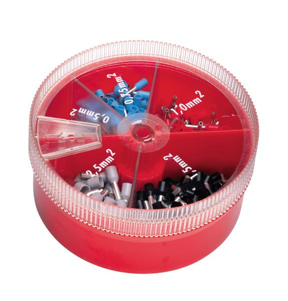 Aderendhülsen-Streudose mit einfacher Querschnittszuordnung der Fächer. Isolierte Aderendhülsen nach Farbreiche 1, gefertigt aus hochwertigen Kupfer-DHP. Die Oberfläche ist galvanisch verzinnt mit einer Mindestschichtstäke von 3 µm für einen maximalen Korrosionsschutz. Der Kunststoffkragen aus Polypropylen sorgt für ein einfaches Einführen der Kupferleiter. Temperaturbeständig bis 105°C, für Leitungen Klasse 5 / 6 nach IEC 60228. Das Set beinhaltet Aderendhülsen in den Größen 0,5 mm², 0,75 mm², 1 mm², 1,5 mm² und 2,5 mm²