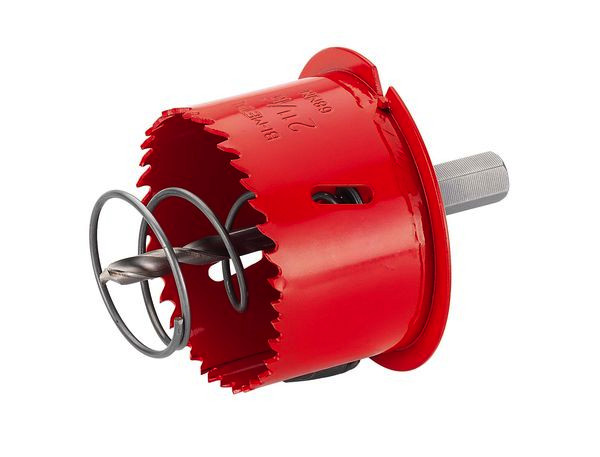 Lochsäge mit einem Ø von 68 mm; mit integriertem Randversenker, Sechskantaufnahme und Ausdruckfeder: HSS-Bi-Metall mit Vario-Zahnung, 11 mm Sechskantaufnahme ohne Mitnehmer, Zentrierbohrer 105 mm, Ø- 6 mm, Ausdruckfeder. Ausführung: für Holz und Rigips: Größe: 68 mm