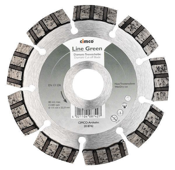 Diamant-Trennscheiben Line Green, mit aufgelaserten Diamantsegmenten, Stammblatthärte: 38 HRC, geeignet für: Betonerzeugnisse (mittelhart/hart), Stahlbeton, Waschbeton, Bordstein, Pflaster, Verbundstein, Dachziegel (mittelhart), Hohlblockstein, Mauerstein, Ziegel (hart), Kalksandstein (hart/hoch verdichtet), Quadroblock, Sandstein (hart), Klinker (hart/mittelhart), Gussrohr (duktil), Schamott (weich), Basalt und Naturstein. Ausführung: 10 mm Höhe; Segment Länge: 31,5 mm; Anzahl: 9; Ø: 115 mm