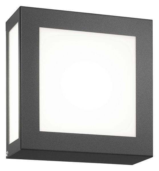 Wandleuchte, Lichtaustritt nach vorne und seitlich, Edelstahl pulverbeschichtet anthrazit, Opalglas, Bewegungsmelder ca. 180°, Zeiteinstellung ca. 10 Sek. - 12 Min., Reichweite: max. 8 m, ohne Leuchtmittel, 1x E27, max. 60W, HxBxT 22x22x9 cm, IP44