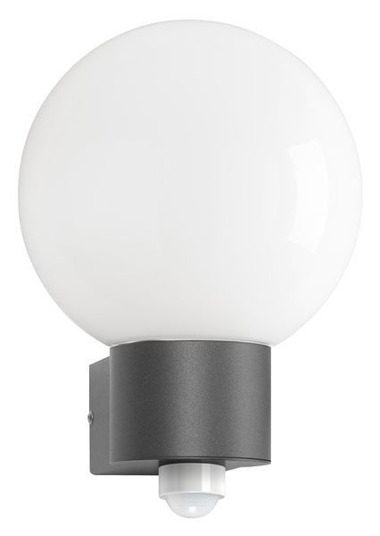 Wandleuchte aus Edelstahl, pulverbeschichtet in Anthrazit, Diffusor aus Opalglas. Integrierter IR-Bewegungsmelder. Farbe Anthrazit, Material Edelstahl, Opalglas, Lichtquelle: 1 x E27, max. 100 Watt, 220-240 V, 50-60 Hz, IP44, Schutzklasse I, Maße: 300x230x260 mm