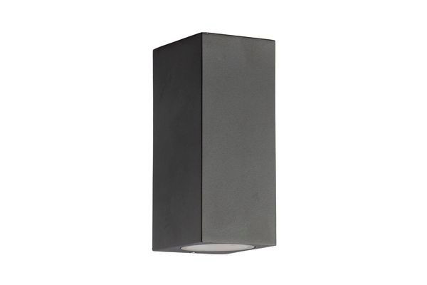 Wandleuchte aus Aluminium-Druckguss, Diffusor aus Klarglas. Farbe Anthrazit, Material Aluminium-Druckguss, Klarglas, Lichtquelle: 2 x GU10, 2 x max. 35 Watt, 220-240 V, 50-60 Hz, IP65, Schutzklasse I, Maße: 165x70x78mm