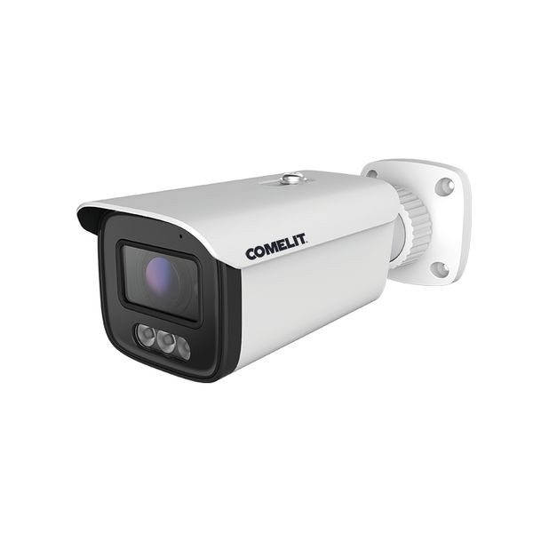 IP Bullet-Kamera ColorUP Serie Next, Festbrennweite 2.8 mm, Auflösung 4MP@30 fps, White LED mit 30 m Reichweite, IR-LED mit 30 m Reichweite (Smart IR), ColorUp Funktion (White LED), Dual Light (IR+White LED mit Personen-/Fahrzeugerkennung) und IR-LED. ONVIF kompatibel. Videoanalysefunktionen: Eindringen in einen Bereich (Unterscheidung Personen/Fahrzeuge), Überschreiten einer Linie (Unterscheidung Personen/Fahrzeuge), Funktion beseitigtes/abgestelltes Objekt. WDR 120Db, H.265+ / H.265 / H.264+ / H.264 / MJPEGVideokomprimierung, SD-Steckplatz (max. 256 GB). Audio: 1 in, eingebautes Mikrofon. Wasserdichtes IP67-Aluminiumdruckgussgehäuse, 12VDC/PoE IEEE802.3afSpannungsversorgung. Kompatible Browser: Google Chrome/Edge/Firefox/Safari. Kompatibles Zubehör: JBA-BA, CMA-BA, WMA-BA, PMA-A, AMA-A.