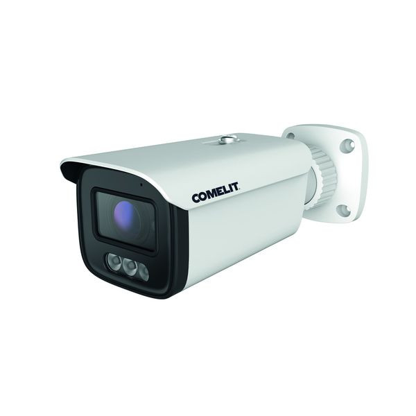 IP Bullet-Kamera ColorUP Serie Next, Festbrennweite 2.8 mm, Auflösung 8MP@20 fps, White LED mit 30 m Reichweite, IR-LED mit 30 m Reichweite (Smart IR), ColorUp Funktion (White LED), Dual Light (IR+White LED mit Personen-/Fahrzeugerkennung) und IR-LED. ONVIF kompatibel. Videoanalysefunktionen: Eindringen in einen Bereich (Unterscheidung Personen/Fahrzeuge), Überschreiten einer Linie (Unterscheidung Personen/Fahrzeuge), Funktion beseitigtes/abgestelltes Objekt. WDR 120Db, H.265+ / H.265 / H.264+ / H.264 / MJPEGVideokomprimierung, SD-Steckplatz (max. 256 GB). Audio: 1 in, eingebautes Mikrofon. Wasserdichtes IP67-Aluminiumdruckgussgehäuse, 12VDC/PoE IEEE802.3afSpannungsversorgung. Kompatible Browser: Google Chrome/Edge/Firefox/Safari. Kompatibles Zubehör: JBA-BA, CMA-BA, WMA-BA, PMA-A, AMA-A.