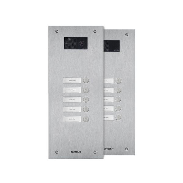 Frontplatte Serie Steel-Switch, 5 Teilnehmer, 1-reihig, universell. Zu vervollständigen mit dem UP-Gehäuse IX9151 oder AP-Gehäuse IX9161 sowie mit dem Lautsprecher Audio oder Audio-Video (Systemabhängig) der Ultra Serie EUxxxx. Die Lautsprecherhalter EU1250A und EU1250V sind enthalten. Frontplatte aus 2,5mm starker Edelstahlplatte V4A und fünf flächenbündig integrierten Klingeltasten. Namensschilder von vorne zu wechseln, inkl. rückseitiger LED-Beleuchtung. Integriertes Ausstattungsmerkmal ist die Handicap-Funktion nach DIN 18040 mit Zustandsanzeige Türruf, Gesprächsbereit, Türöffnerfunktion und Teilnehmererreichbarkeit visuell mit LED´s hinter genormten Handicap Symbolen sowie akustischer Sprachausgabe der Zustände. Schlagfestigkeit: IK08. Abmessungen: 369,1x150x2,5mm.