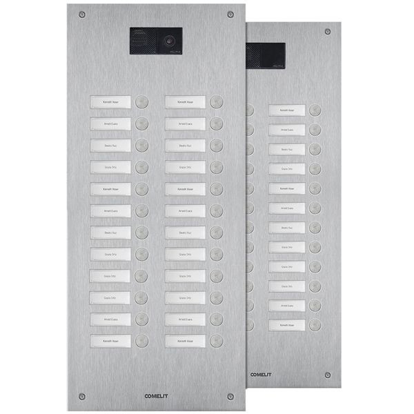 Frontplatte Serie Steel-Switch, 24 Teilnehmer, 2-reihig, universell. Zu vervollständigen mit dem UP-Gehäuse IX9154 oder AP-Gehäuse IX9164 sowie mit dem Lautsprecher Audio oder Audio-Video (Systemabhängig) der Ultra Serie EUxxxx. Die Lautsprecherhalter EU1250A und EU1250V sind enthalten. Frontplatte aus 2,5mm starker Edelstahlplatte V4A und vierundzwanzig flächenbündig integrierten Klingeltasten. Namensschilder von vorne zu wechseln, inkl. rückseitiger LED-Beleuchtung. Integriertes Ausstattungsmerkmal ist die Handicap-Funktion nach DIN 18040 mit Zustandsanzeige Türruf, Gesprächsbereit, Türöffnerfunktion und Teilnehmererreichbarkeit visuell mit LED´s hinter genormten Handicap Symbolen sowie akustischer Sprachausgabe der Zustände. Schlagfestigkeit: IK08. Abmessungen: 502,1x216,4x2,5mm.