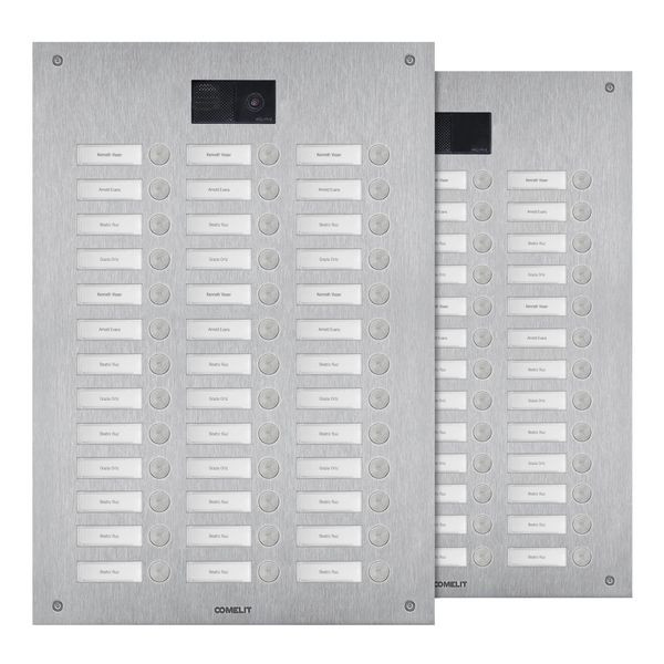 Frontplatte Serie Steel-Switch, 39 Teilnehmer, 3-reihig, universell. Zu vervollständigen mit dem UP-Gehäuse IX9180 oder AP-Gehäuse IX9176 sowie mit dem Lautsprecher Audio oder Audio-Video (Systemabhängig) der Ultra Serie EUxxxx. Die Lautsprecherhalter EU1250A und EU1250V sind enthalten. Frontplatte aus 2,5mm starker Edelstahlplatte V4A und neununddreißig flächenbündig integrierten Klingeltasten. Namensschilder von vorne zu wechseln, inkl. rückseitiger LED-Beleuchtung. Integriertes Ausstattungsmerkmal ist die Handicap-Funktion nach DIN 18040 mit Zustandsanzeige Türruf, Gesprächsbereit, Türöffnerfunktion und Teilnehmererreichbarkeit visuell mit LED´s hinter genormten Handicap Symbolen sowie akustischer Sprachausgabe der Zustände. Schlagfestigkeit: IK08. Abmessungen: 502x303x2,5mm.