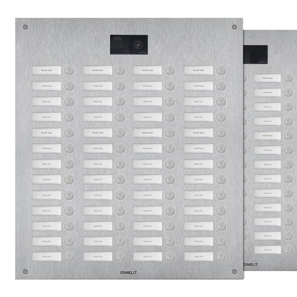 Frontplatte Serie Steel-Switch, 52 Teilnehmer, 4-reihig, universell. Zu vervollständigen mit dem UP-Gehäuse IX9181 oder AP-Gehäuse IX9177 sowie mit dem Lautsprecher Audio oder Audio-Video (Systemabhängig) der Ultra Serie EUxxxx. Die Lautsprecherhalter EU1250A und EU1250V sind enthalten. Frontplatte aus 2,5mm starker Edelstahlplatte V4A und zweiundfünfzig flächenbündig integrierten Klingeltasten. Namensschilder von vorne zu wechseln, inkl. rückseitiger LED-Beleuchtung. Integriertes Ausstattungsmerkmal ist die Handicap-Funktion nach DIN 18040 mit Zustandsanzeige Türruf, Gesprächsbereit, Türöffnerfunktion und Teilnehmererreichbarkeit visuell mit LED´s hinter genormten Handicap Symbolen sowie akustischer Sprachausgabe der Zustände. Schlagfestigkeit: IK08. Abmessungen: 502x409x2,5mm.