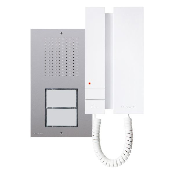 Paketlösung Ciao Audio inklusive Mini mit Hörer, SB2, AP, Silber. Dieses Kit besteht aus dem Basiskit KCA2061B (1x Türstation CA2100B, 1x Netzteil 1209, 1x Innenstation Mini mit Hörer 2738W/A, 1x Einzeltaste CA9213, 1x Doppeltasten CA9210), zuzüglich 1x Innenstation 2738W/A.