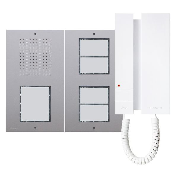 Paketlösung Ciao Audio inklusive Mini mit Hörer, SB2, AP, Silber. Dieses Kit besteht aus dem Basiskit KCA2061B (1x Türstation CA2100B, 1x Netzteil 1209, 1x Innenstation Mini mit Hörer 2738W/A, 1x Einzeltaste CA9213, 1x Doppeltasten CA9210), zuzüglich 4x Innenstationen 2738W/A, 1x Tastenmodulerweiterung CA2200x und 1x Doppeltasten CA9210.