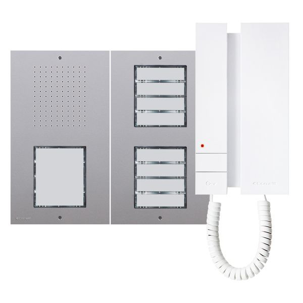Paketlösung Ciao Audio inklusive Mini mit Hörer, SB2, AP, Silber. Dieses Kit besteht aus dem Basiskit KCA2061B (1x Türstation CA2100B, 1x Netzteil 1209, 1x Innenstation Mini mit Hörer 2738W/A, 1x Einzeltaste CA9213, 1x Doppeltasten CA9210), zuzüglich 8x Innenstationen 2738W/A, 1x Tastenmodulerweiterung CA2200x und 2x Vierfachtasten CA9211.