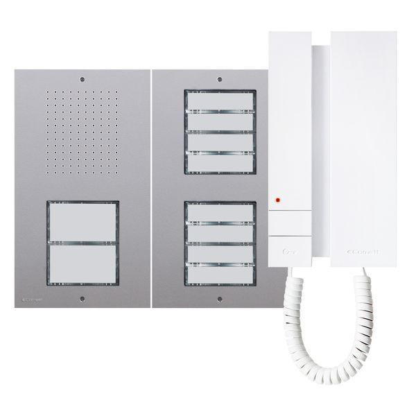 Paketlösung Ciao Audio inklusive Mini mit Hörer, SB2, AP, Silber. Dieses Kit besteht aus dem Basiskit KCA2061B (1x Türstation CA2100B, 1x Netzteil 1209, 1x Innenstation Mini mit Hörer 2738W/A, 1x Einzeltaste CA9213, 1x Doppeltasten CA9210), zuzüglich 9x Innenstationen 2738W/A, 1x Tastenmodulerweiterung CA2200x und 2x Vierfachtasten CA9211.