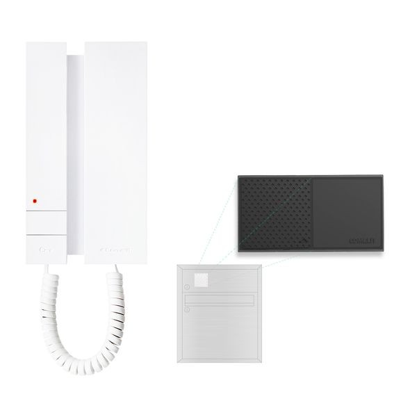 Paketlösung Ultra Audio inklusive Mini mit Hörer 2738W/A, SB2, Hinterbau. Es können maximal 4 Innenstationen Audio pro Teilnehmer installiert werden. Dieses Kit besteht aus: 1x Lautsprecherhalter EU1250R, 1x Lautsprecher Audio EU2010, 1x Tastenschnittstelle 3063U, 1x Netzgerät 1210, 7x Innenstation Mini mit Hörer 2738W/A.