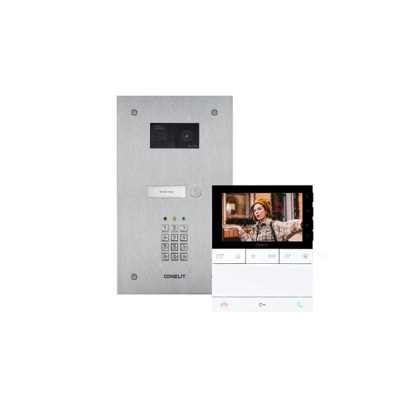 Einfamilienhauskit Steel-Switch mit Codetastatur (KeyPad) und Logos, SB2. Dieses Kit ist im Auslieferungszustand komplett auf Adresse 1 voradressiert und muss lediglich installiert und elektrisch angeschlossen werden. Es können maximal 4 Innenstationen Audio oder Video im Master / Slave Modus installiert werden. Mit der Codetastatur können, unabhängig voneinander, zwei verschiedene Ralais (NO/NC/COM; NO/COM)angesteuert werden um beispielsweise einen Türöffner, ein Motorschloss oder eine Tor zu betätigen. Dieses Kit besteht aus: 1x Frontplatte Switch IX0101KPU, 1x Lautsprecherhalter EU1250V, 1x UP-Gehäuse IX9150, 1x Lautsprecher Video EU2020/4, 1x SK9015 Anschlussmodul, 1x Netzgerät 1210A, 1x Innenstation Video LS8741, 1x Abzweigklemme 1214/2C und 1x Abschlusswiderstand 1216.