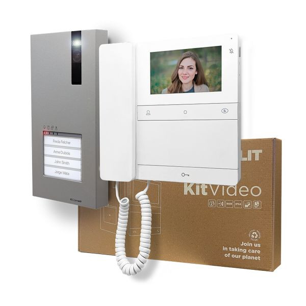 Einfamilienhauskit Quadra mit Logos 4,3" hörergebunden, SB2 Video Kit. Dieses Kit ist im Auslieferungszustand komplett auf Adresse 1 voradressiert und muss lediglich installiert und elektrisch angeschlossen werden. Zusätzlich besteht die Möglichkeit die Klingeltaste via DIP Schaltercode zu teilen oder zu vierteln und dieses Kit durch Erweiterung weiterer Innenstationen, Audio oder Video, in ein Zweifamilienhaus oder Vierfamilinehaus Kit umzuwandeln. Es können maximal 4 Innenstationen Audio oder Video pro Teilnehmer installiert werden. Dieses Kit besteht aus: 1x Türstation Quadra Art. 4893M zur Aufputzmontage, 1x Netzteil Art. 1209, 1x Logos Innenstation mit Hörer Art. LS8701, Abzweigklemme Art. 1214/2C und Abschlusswiderstand Art. 1216. Mit dem optionalen Zubehörartikel 4792E kann die horizontale Neigung der Türstation Quadra um 25° verändert werden.