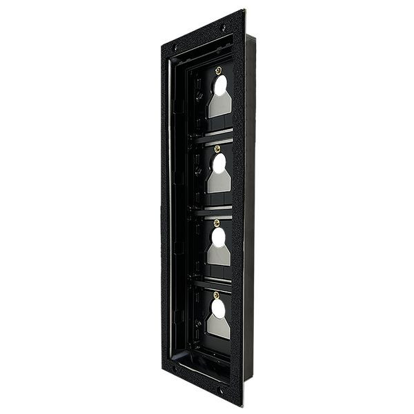 Flächenbündiges Einbaugehäuse für die Befestigung von 4 Ultra Modulen auf eine Frontplatte von Drittherstellern mit 1,5 ÷ 3mm Materialstärke. Das flächenbündige Einbaugehäuse ist für die Montage auf 2,5mm Materialstärke vorbereitet. Für Frontplatten mit einer Materialstärke von 1,5 oder 3mm muss ein entsprechendes Unterlegeblech entfernt bzw. hinzugefügt werden. Die Montage erfolgt von der Rückseite der Frontplatte auf bauseits vorgerichtete Gewindebolzen. Die Abmessungen werden der Anleitung entnommen.