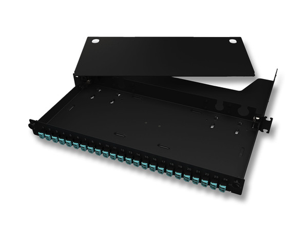 Glasfaser-Verteilerfeld bestückt nur mit Kupplungen (ADTP) – Breakout Version, LC Duplex OM3/4, 48 Fasern, türkis Kupplungen, schwarz