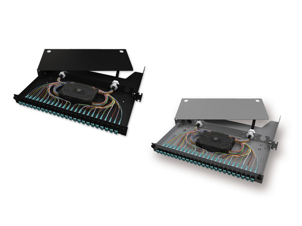 Glasfaser-Verteilerfeld bestückt nur mit Kupplungen (ADTP) – Breakout Version, LC Duplex OM3/4, 48 Fasern, violette Kupplungen, schwarz