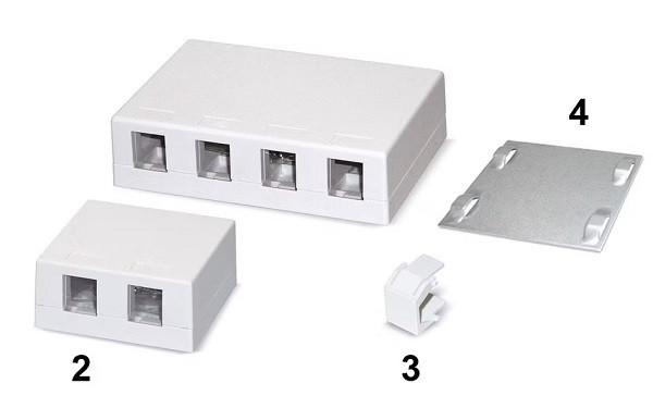 Kompakte AP Anschlussdosen aus Kunststoff für die schnelle Aufputzmontage zur Aufnahme von maximal 2, 4 oder 6 Modulen mit Keystone-Befestigung. Alle Anschlussdosen mit Beschriftungsfeld. Modelle für 2 oder 4 Module sind wahlweise mit oder ohne integrierte Staubschutzklappen erhätlich. Alle geschirmten und ungeschirmten Keystone-Module toolless sowie die PS-GG45 7A-Module (mit Clip) lassen sich mühelos in die Dosen einklicken. Zur Montage der Module muss lediglich ein kleiner Steg entfernt werden. Lieferung erfolgt ohne Module.