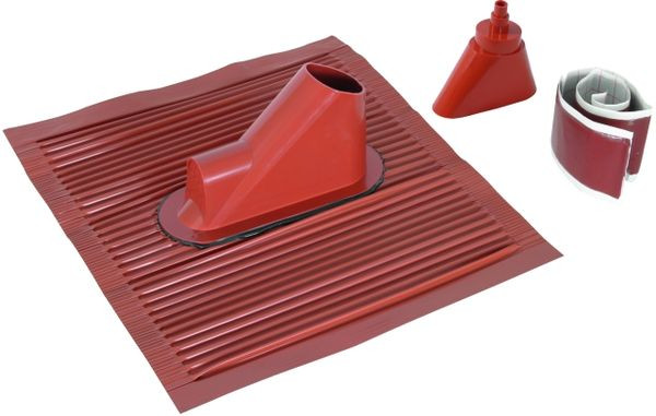Dachdurchführungsset, zum Durchführen und Abdichten von Masten und Rohren (Dachsparrenhalter) auf Steildächern. Für die universelle Anwendung an verschiedenen Dachziegeln / Dachsteinen durch verformbaren Aluminium-Dachziegel. Ausführung Alu-Dachziegel Farbe rot, Gummitülle und Dichtungsband.