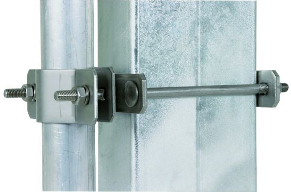 Geländerbefestigung zum Befestigen von Stützrohren (D50 mm) oder Fangstangen (D40 mm) z. B. an Vierkant-Hohlprofile.