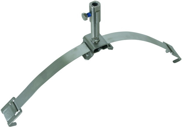 Halter für Fangspitzen oder Distanzstäbe GFK Ø10 mm mit Leitungshalter, zum Schutz für Solarthermie-Module oder Photovoltaik-Generatoren oder andere Aufbauten auf Steildächern. Die Montage des Halters basiert auf der Spannbandtechnik. Mit einem fest montierten Bügel am Spannband und einem weiteren verstellbaren Bügel kann der Halter an den verschiedensten Formen des Firstziegels montiert werden.