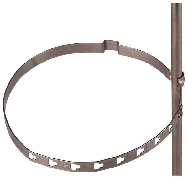 Leitungshalter zum Verlegen von Ableitungen an Regenfallrohren. Ausführung Typ PS schraubenlos, mit Prägungen für Zange, fester Leitungsführung.