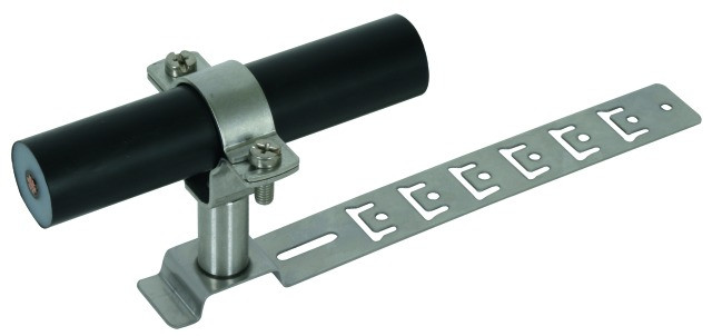 Dachleitungshalter mit Zweischraubenüberleger aus NIRO zum Verlegen der HVI power Leitung in Dachflächen von Satteldächern. Ausführung mit geprägter Strebe, für Leitung 27 / 30 mm (feste Leitungsführung).